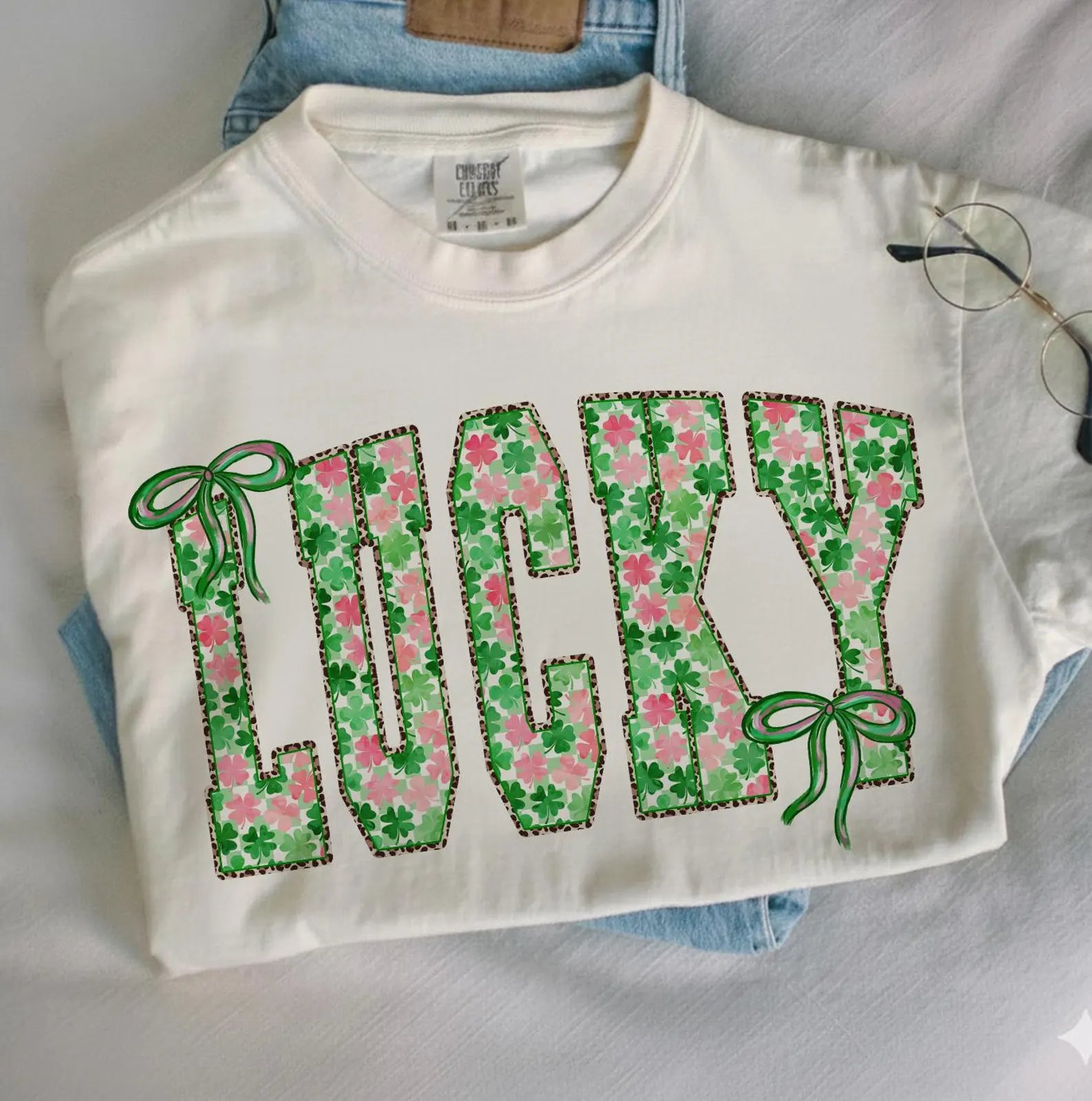Add a little charm (and a lot of luck!) to your wardrobe with our Lucky Floral Bow Tee. Featuring bold block lettering filled with a soft pink and green floral pattern, this design is accented with adorable green bow details for the perfect feminine touch. Whether you’re celebrating St. Patrick’s Day or just feeling lucky year-round, this tee is a standout.