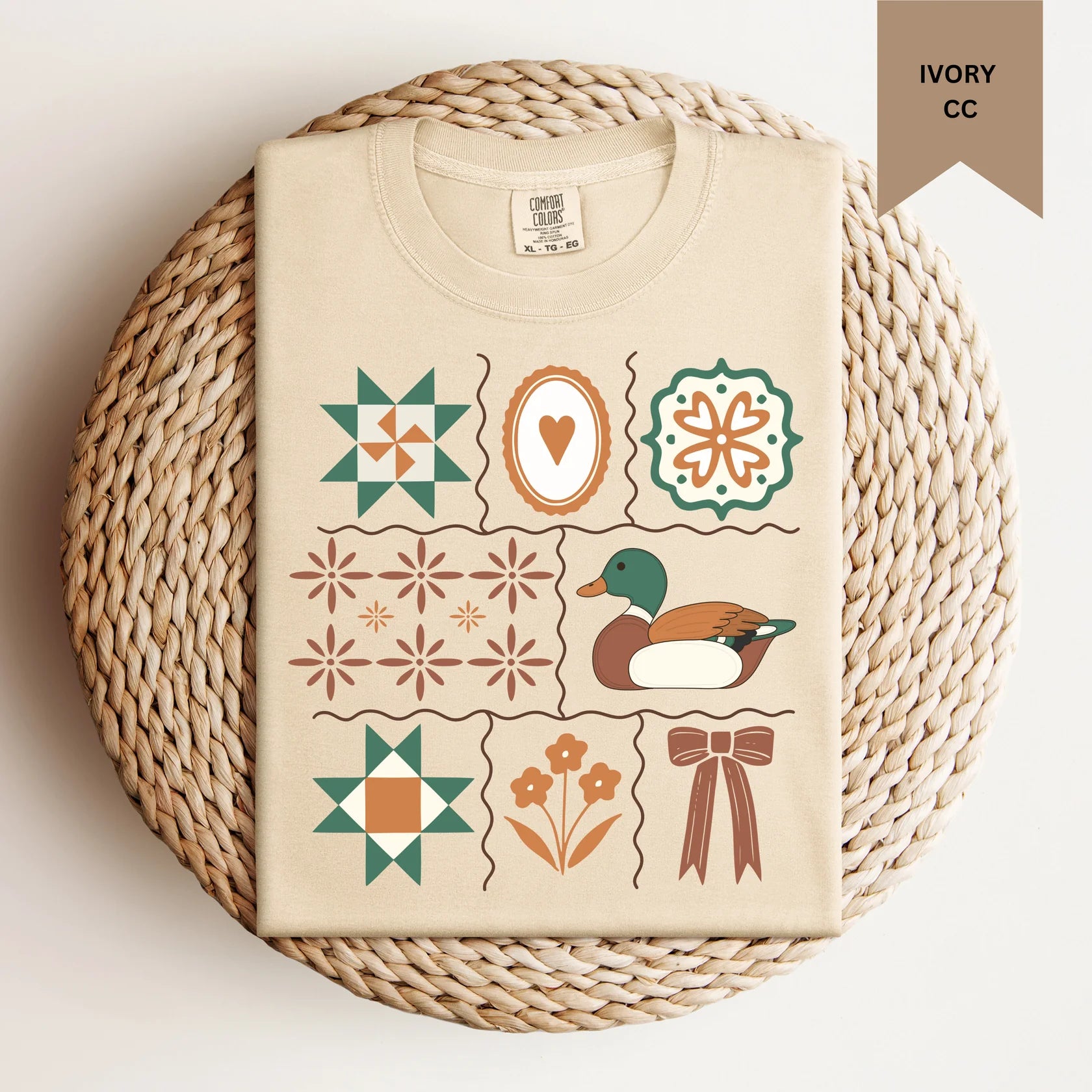 Add cozy charm to your everyday wardrobe with this ivory graphic tee featuring a vintage-inspired patchwork design. Showcasing a whimsical mallard duck alongside quilt-style motifs, florals, and rustic accents, this tee brings a warm, cottage-core feel with a playful twist. Made from soft, comfortable cotton, it’s perfect for casual days, layering, or relaxed weekends. Easy to style with jeans or leggings, this tee is a must-have for lovers of unique graphics and effortless comfort.